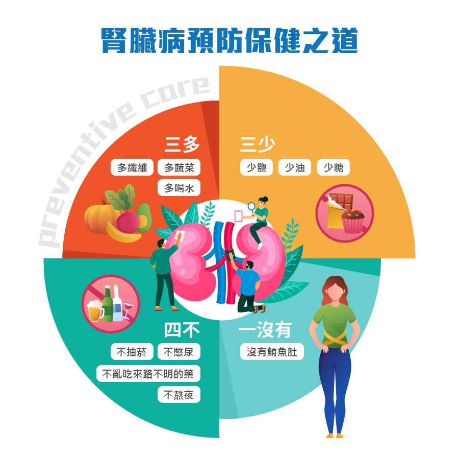 而腎臟保健的方式有哪些呢? 在國民健康署的腎臟健康保健口訣中,遵守『三多、三 少、四不、一沒有』,一起在日常生活中執行腎臟養護計畫,讓我們人生逆轉『腎』。