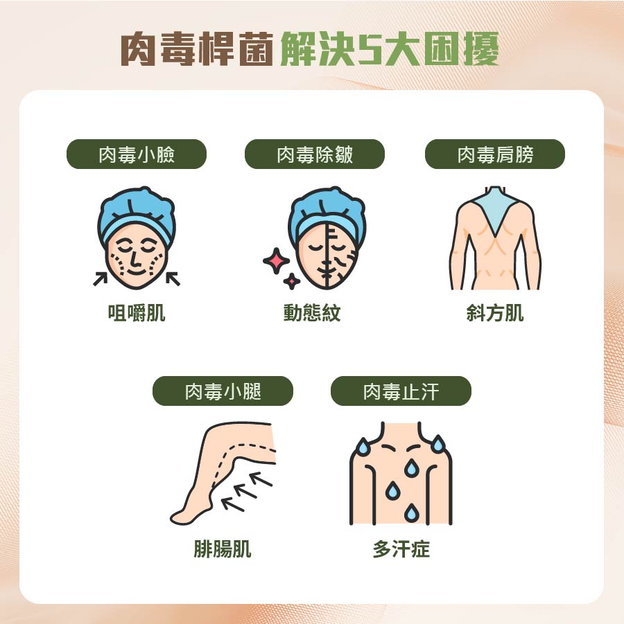 臨床中經常使⽤在動態紋或因年紀而過度增加的面部肌肉張⼒,例如: 抬頭紋、皺眉紋、魚尾紋、法令紋、木偶紋等肌肉;老化毛孔的毛孔皺紋;喜歡進⾷有口感的⾷物而過度使⽤的咀嚼肌(國字臉)、體態遺傳的發達腓腸肌(蘿蔔腿);造成肩頸痠痛的斜⽅肌,甚至是多汗症等困擾都能利用肉毒桿菌來治療改善。