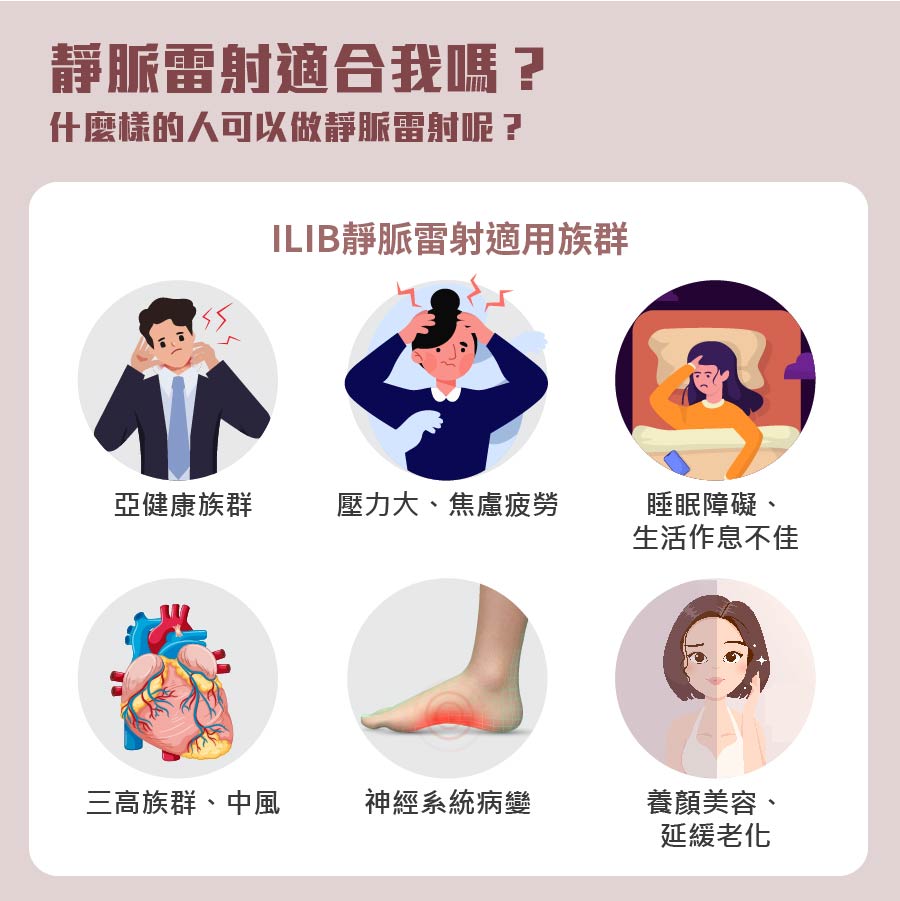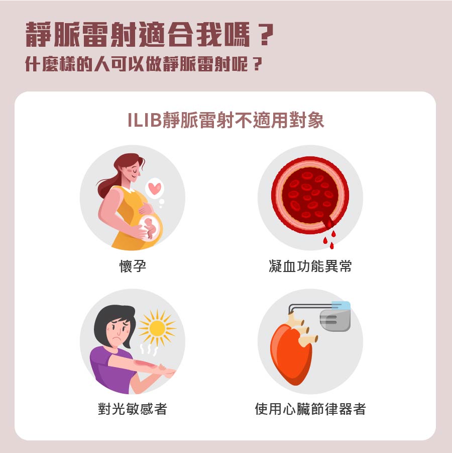 半導體靜脈雷射 ILIB 紅光 1.提升紅血球攜氧量2.增加血循環速度3.降低血液黏稠度藍光 1.增加一氧化氮(NO)釋放2.提高代謝排毒能力3.減少體內發炎因子► 靜脈雷射適合我嗎?什麼樣的人可以做靜脈雷射呢?